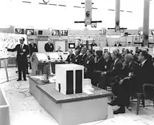 George Edwin Mueller (/ˈmɪlər/; July 16, 1918 – October 12, 2015), was an American electrical engineer who was an associate administrator at NASA, heading the Office of Manned Space Flight from September 1963 until December 1969. Hailed as one of NASA's "most brilliant and fearless managers",[1] he was instrumental in introducing the all-up testing philosophy for the Saturn V launch vehicle, which ensured the success of the Apollo program in landing a man on the Moon and returning him safely to the Earth by the end of 1969. Mueller also played a key part in the design of Skylab,[2] and championed the Space Shuttle's development, which earned him the nickname, "the father of the Space Shuttle."