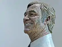 In 1980, sculptor Robert Arneson was commissioned to create a monument to Moscone to be installed in the new Moscone Convention Center. The bust portraying Moscone[22] was done in Arneson's California Funk style and was accepted by San Francisco's Art Commission. Arneson included as part of the sculpture on the pedestal the likeness of a pistol, and references to Harvey Milk, the assassinations, the "Twinkie Defense", the White Night riots, and Dianne Feinstein's mayoral succession. Arneson refused to make alterations to the work, the commission was returned to him, and it was later resold to the SF Museum of Modern Art. In a critique of the event, Frederic Stout wrote that "Arneson's mistake was in presenting the city mothers/fathers with something honest, engaging and provoking, that is to say, a work of art. What they wanted, of course, was not a work of art at all. They wanted an object of ritual magic: the smiling head of a dead politician." In 1994, a new bust by San Francisco artist Spero Anargyros was unveiled, depicting Moscone holding a pen, below which are words from Moscone: "San Francisco is an extraordinary city, because its people have learned to live together with one another, to respect each other, and to work with each other for the future of their community. That's the strength and beauty of this city – it's the reason why the citizens who live here are the luckiest people in the world."[23]