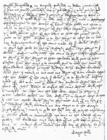 - "Right honourable and my singular good lady, my duty remembered, I have me humbly recommended unto your good ladyship and to my good Lord Lyle advertising your ladyship that I received your ladyship's letter by which ye willed me to speak with my Lady Coffyn for her title in East Haggynton in the county of Devon who had one estate in tail to him and to his heirs of her body begotten; and now he is dead without issue of his body so that the reversion should revert to Mr John Basset and to his heirs so there be no let nor discontinuance of the same made by Sir William Coffyn in his life. Howbeit Mr Richard Coffyn, next heir to Sir William Coffyn, claimeth the same by his uncle's feoffment to him and to his heirs so that the law will put Mr John Basset from his entry and to compel him to take his action of form down[15] which is much dilatory as Mr Basset knoweth albeit I intend to sue unto one writ of diem clausit extremum after the death of the said Sir William and so to find Mr Basset's title if we may come and attain any evidence,[16] when we come home, of John Davy,[17] to enforce the same which will cost v marks at least. But the best way when Mr Harys and I meet shall be taken. My Lady Coffyn is in Leicestershire so that I could not speak with her in this matter. And if my lord or your ladyship will command me any service into the country I (God willing) intend to ride[18] the viii th day of March next coming and shall be glad to accomplish the same to the utterest of my power as knoweth our Lord who preserve you both in honour long to endure. Ffrom London the last day of Ffebruary, by your assuryd servant George Rolle".