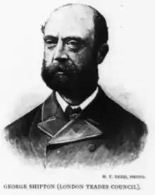 In the late 1880s, Shipton opposed the New Unionism. Although the universal franchise was some years off, he claimed that "when the people were unenfranchised, were without votes, the only power left to them was the demonstration of numbers. Now, however, the workmen have votes."[5] In 1890, Tom Mann and Ben Tillett, proponents of the New Unionism wrote a document entitled The "NEW" Trade Unionism: a reply to Mr George Shipton.[6] He was defeated for the Secretaryship of the Parliamentary Committee of the TUC,[7] but remained the Secretary of the London Trades Council until 1896.