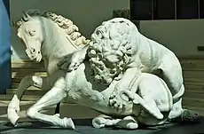 An anecdote regarding the origin of the subject matter emerged soon after the artist death, originally published in The Sporting Magazine in 1808, and reiterate often for well over a century and a half. Art historian H. W. Janson repeated it "On a visit to North Africa, he had seen a horse killed by a lion; this experience haunted his imagination, and from it he developed a new type of animal picture full of Romantic feeling for the grandeur and violence of nature."[13]: 567 p. However, research published in 1965 produced a rather persuasive argument that Stubbs in fact never traveled to Africa, and the actual inspiration for the painting was an antique sculpture he had seen in a well documented 1754 stay in Rome. The sculpture, Lion Seizing a Horse, in the Palazzo dei Conservatori, Rome, is a restored Roman copy of a Hellenistic original. It has been a celebrated work since the Renaissance, admired by Michelangelo, included in guidebooks of Stubbs's day, and copied any number of times by various artist in marble, bronze, and prints, including an 18th century marble copy in the collection of Stubbs's patron Henry Blundell, who also acquired one of the paintings by Stubbs.[11]: 90–91 p. [12]