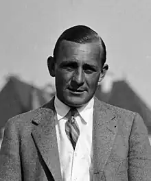 In the 1920s amateur golf was in its heyday, with famous players such as Bobby Jones, Chick Evans, and Francis Ouimet. Von Elm's duels with Jones became legendary. In 1923 Von Elm advanced to the quarter-finals of the U.S. Amateur, but lost to former champion Ouimet.[3] In 1924 Von Elm surprised the top golfers by finishing the U.S. Amateur as runner-up to Jones, though Jones won the final match at the Merion Golf Club by a resounding 9 and 8 margin. Von Elm became the first player from west of the Mississippi River to reach the final.[6] The following year Jones eliminated Von Elm in the semifinals, at the Oakmont Country Club. But Von Elm persisted, and in 1926 succeeded in defeating Jones, who had already won the British Open and the U.S. Open that year, to collect the U.S. Amateur title in September at the Baltusrol Golf Club in northeastern New Jersey. A record-breaking crowd of 10,000 erupted with cheers as, in the words of an Associated Press reporter, "The monarch of golf was toppled from his amateur throne...by flaxen-haired George Von Elm...in one of the most stunning upsets of links history." Von Elm, who became the first champion from west of the Mississippi River, was presented with a new car by members of the Rancho Park Golf Course, his home club, upon his return to Los Angeles following the Amateur victory;[7] Jones received a similar gift from Sarasota, Florida golfers that same year, following his wins in the two major Opens.[8]
