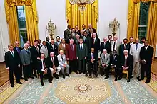 Will (at far left) with members of the Baseball Hall of Fame and George W. Bush at the White House in 2004