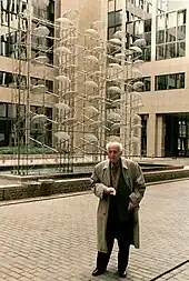 The following year, Zongolopoulos made his inaugural appearance in Salon de la jeune sculpture exhibition while in 1966 he won the first prize in the contest of Thessaloniki International Fair thanks to his sculpture Cor-ten,[3] a 17-metre-high artwork that according to its creator is an abstract representation of Nike of Samothrace.[13] which is placed at the north entrance of the exhibition's site.[14] The same year he was honoured by king Constantine for his contribution in Greek Art but he kindly avoided to attend the reception and to receive the medal.[3]