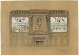 Upon returning to Paris, he was named inspector of works for the Court of Cassation. In 1871, he became their official architect. The year before, he had succeeded Félix Duban as architect of the École. In that capacity, he completed their "Glazed Courtyard", and installed a Renaissance museum in the chapel with its adjoining corridor.[1] In 1875, he was appointed architect for the Diocese of Laval, and designed a monument commemorating the Battle of Coulmiers, in Loiret. This led to his becoming a Knight in the Legion of Honor.[2]