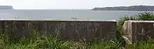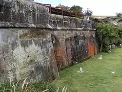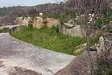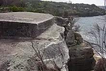 On 10 March 1801 Governor Philip Gidley King informed the Secretary of State for Colonies that a battery was "in forwardness opposite the entrance to the Harbour, which will completely prevent attack from without". Despite that confidence, the job took another two years to finish. With only picks, crowbars, wedges and sledgehammers, a gun pit was cut out of solid sandstone, leaving a curved parapet 24-metre (80 ft) long on the cliff edge about 15 metres (50 ft) above sea level. There were two embrasures or gun openings, but guns could also be fired over the parapet. The guns – four twelve-pounders and two six-pounders – were landed at Obelisk Beach (then known as Georges Beach) and hauled up through the bush. Also in the gun pit was built a magazine for powder and shot, with stone walls three feet thick.[5] The Sydney Gazette reported on 23 October 1803 that "The new battery is compleated and the artificers and labourers recalled ... the battery mounts six guns, two long twelves [12 pounders] on the right, two of the same size on the left and two short sixes in the centre. The first of these command the bay inwardly, those on the left command the entrance of the harbour between the heads and those in the centre point across the channel."[6]