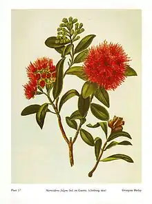 Hetley went to England to seek a publisher, receiving assistance along the way from authorities at Kew, and the chromolithographs were ultimately produced in 1888 by Leighton Brothers. The plates also had the distinction of being published in a French edition a year later.[5] The inclusion in the book of Loranthus adamsii is notable as this native mistletoe was discovered by Mr James Adams of the Thames goldfields shortly before it became extinct. Without the work of botanical artists such as Hetley there would be no record of what this plant truly looked like.[4] While in London, her work was exhibited at the Colonial and Indian Exhibition.