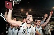 Balogiannis lifting the Greek Basketball Cup trophy as captain of PAOK in 1999.