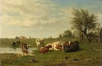 Later in 1859 he began painting in the county-area around Leiden, often 'meadows with cattle'. Here he tried to reproduce the moods that the Dutch flat landscape evoked by using peculiar light effects as well as 'a colored, fragrant warm grey.' In July 1860 he wrote: "I am searching for a tone, which we call 'colored grey'. I mean that all colors, even the strongest, can be brought together in such a way as to give the impression of a warm, vital grey.".[4] When he mixed all the colors of the palette just with grey to get this graying effect, he was usually dissatisfied with the result. His attempts in mixing unbroken colors foreshadowed the later tonal painting style of the Hague School painters.