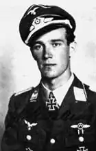 He once more became an "ace-in-day" on 7 May, taking his total to 121 aerial victories claimed, making him a five-time "ace-in-day".[38] For these achievements, Hoffmann was awarded the Knight's Cross of the Iron Cross (Ritterkreuz des Eisernen Kreuzes) on 14 May 1944 for 125 aerial victories claimed.[2][39] While 4. Staffel was withdrawn from the Eastern Front and subordinated to Jagdgeschwader 3 "Udet" (JG 3—3rd Fighter Wing) fighting on the Western Front, Hoffmann was transferred to the Ergänzungs-Jagdgruppe West, a supplementary fighter pilot training unit, in May 1944.[40] There, he served as a fighter pilot instructor and was promoted to Leutnant (second lieutenant).[1]