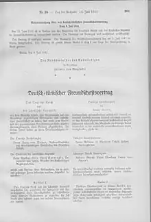 The German–Turkish Treaty of Friendship (German: Türkisch-Deutscher Freundschaftsvertrag, Turkish: Türk-Alman Dostluk Paktı) was a non-aggression pact signed between Nazi Germany and Turkey on 18 June 1941 in Ankara by German ambassador to Turkey Franz von Papen and Turkish Minister of Foreign Affairs Şükrü Saracoğlu.[1][2] It went into effect on the same day.