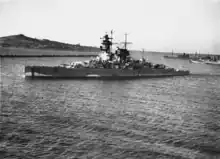 Admiral Graf Spee spent the first three months of her career conducting extensive sea trials to ready the ship for service. The ship's first commander was Kapitän zur See (KzS) Conrad Patzig; he was replaced in 1937 by KzS Walter Warzecha.[9] After joining the fleet, Admiral Graf Spee became the flagship of the German Navy.[11] In the summer of 1936, following the outbreak of the Spanish Civil War, she deployed to the Atlantic to participate in non-intervention patrols off the Republican-held coast of Spain. Between August 1936 and May 1937, the ship conducted three patrols off Spain.[12] On the return voyage from Spain, Admiral Graf Spee stopped in Great Britain to represent Germany in the Coronation Review at Spithead for King George VI on 20 May.[11]