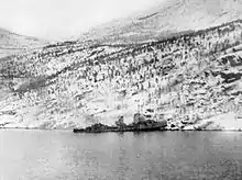 Georg Thiele was allocated to Group 1 for the Norwegian portion of Operation Weserübung in April 1940. The group's task was to transport the 139th Mountain Infantry Regiment (139. Gebirgsjäger Regiment) and the headquarters of the 3rd Mountain Division (3. Gebirgs-Division) to seize Narvik. The ships began loading troops on 6 April and set sail the next day.[13] The German destroyers reached the Ofotfjord on the morning of 9 April and Commodore Friedrich Bonte took his flagship Wilhelm Heidkamp, Georg Thiele and Z11 Bernd von Arnim down the fjord to Narvik.[14] A heavy snowstorm allowed Thiele and von Arnim to enter the harbor without challenge and tie up at a pier.