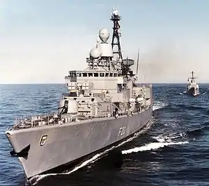 Köln sailed from Wilhelmshaven on 2 January 2002 to join the force supporting Operation Enduring Freedom. She spent 6½ months on deployment, before returning to Wilhelmshaven in mid-July. She was again deployed in support of Operation Enduring Freedom, operating off the Horn of Africa and the Arabian Peninsula from April to October 2007, succeeding her sister ship Bremen as part of Combined Task Force 150.[2] On 30 August 2010 Köln joined Operation Atalanta, the EU's anti-piracy mission off the Horn of Africa, replacing the frigate Schleswig-Holstein, and returning to Wilhelmshaven on 10 December 2010.[3] Köln embarked on her final deployment on 29 August 2011, joining Operation Atalanta, and returning to Wilhelmshaven on 9 December 2011.[4][5]