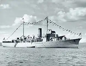 At the outbreak of the Second World War, the Olav Tryggvason took part in neutrality protection duties. Her first armed action came on 3 November 1939,[8] when the US merchant ship City of Flint entered Norwegian territorial waters. The City of Flint had been taken as a prize by the German pocket battleship Deutschland in the Atlantic and was on its way to Germany with the American crew as prisoners. According to public international law, the ship could have passed through Norwegian waters without interference, but when she stopped and anchored in the port of Haugesund, the Germans broke Norwegian neutrality regulations.[8] The German prize crew had brought the City of Flint into Haugesund to escape the British naval forces which searched for them. When the British cruiser HMS Glasgow approached the City of Flint on 2 November the escorting Olav Tryggvason had confronted the British warship and made it leave Norwegian waters.[9] Olav Tryggvason boarded the City of Flint with one officer and thirty armed sailors, who returned control of the ship to the American captain, Joseph H. Gainard, on 6 November. He unloaded his cargo in Bergen and set sail in ballast for the US. The German prize crew was interned at Kongsvinger Fortress. In response, the Norwegian Ministry of Foreign Affairs received several strongly worded and threatening notes from its German counterpart.