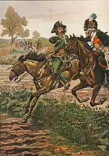 - Arquebusiers. Bottle green tunic with black lining and lapels, white collar, light-blue cuffs. Green trousers, black gaiters. Black waistcoat with two rows of yellow buttons. Two epaulettes mottled in three colors. Casquette as above.