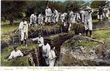 The German army opened the war on the Western Front with a modified version of the Schlieffen Plan, designed to quickly attack France through neutral Belgium before turning southwards to encircle the French army on the German border. The Belgians fought back, and sabotaged their rail system to delay the Germans. The Germans did not expect this and were delayed, and responded with systematic reprisals on civilians, killing nearly 6,000 Belgian noncombatants, including women and children, and burning 25,000 houses and buildings.[14] The plan called for the right flank of the German advance to converge on Paris and initially, the Germans were very successful, particularly in the Battle of the Frontiers (14–24 August). By 12 September, the French with assistance from the British forces halted the German advance east of Paris at the First Battle of the Marne (5–12 September). The last days of this battle signified the end of mobile warfare in the west. The French offensive into Germany launched on 7 August with the Battle of Mulhouse had limited success.[15]