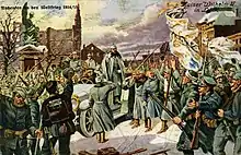 The "spirit of 1914" was the overwhelming, enthusiastic support of all elements of the population for war in 1914. In the Reichstag, the vote for credits was unanimous, with all the Socialists but one (Karl Liebknecht) joining in. One professor testified to a "great single feeling of moral elevation of soaring of religious sentiment, in short, the ascent of a whole people to the heights."[24] At the same time, there was a level of anxiety; most commentators predicted the short victorious war – but that hope was dashed in a matter of weeks, as the invasion of Belgium bogged down and the French Army held in front of Paris. The Western Front became a killing machine, as neither army moved more than a few hundred yards at a time. Industry in late 1914 was in chaos, unemployment soared while it took months to reconvert to munitions productions. In 1916, the Hindenburg Program called for the mobilization of all economic resources to produce artillery, shells, and machine guns. Church bells and copper roofs were ripped out and melted down.[25]