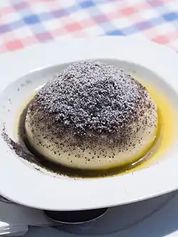 Germknödel ([ˈɡɛɐ̯mˌknøːdl̩] in Austrian German) is a fluffy yeast dough dumpling (knödel),[1] filled with spiced plum jam and served with melted butter and a mix of poppy seeds and sugar on top. It is occasionally – even though less traditional – served with vanilla cream sauce instead. It is a culinary specialty of Austria and Bavaria. The dish is served both as a dessert and as a main course.