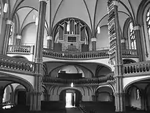 Gethsemane Church, like Zion's Church, harmonically combines the outside impression of a longish shape, as typical for traditional (Roman Catholic) churches, due to their long inside nave and the centralised auditory hall, as typical for genuine Protestant church buildings.[5] Inside the crossing is extended to a wide octagon, including the side naves, allowing the congregants a good view and listening. The pulpit originally stood in the centre of the octagon.[6] Due to the high number of congregants at the time of its construction, lofts hang around the octagonal prayer hall except of its eastern side, which is open to the quire. On the western side of the octagon the lofts are even double storied with an additional upper organ loft. The building weathered the Second World War intact. In 1961, the interior was renovated. On this occasion the altar was drawn from the apse into the prayer hall.[7]