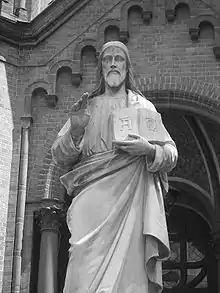 The statue of the Benedictive Christ, rescued from the Church of Reconciliation (German: Versöhnungskirche), before it was exploded in 1985 by the GDR government in order to clear more space along the Berlin Wall, now (since 1993) stands outside in front of the western portal of Gethsemane Church. A bronze statue of the Benedictive Christ (after Bertel Thorvaldsen) originally shown at the western entrance is now presented on the cemetery of the congregation in Berlin-Nordend.[11]