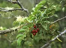 Gevuina avellana (Chilean hazelnut (avellano chileno in Spanish), or Gevuina hazelnut), is an evergreen tree, up to 20 meters (65 feet) tall. It is the only species currently classified in the genus Gevuina. It is native to southern Chile and adjacent valleys in Argentina. It is found from sea level to 700 meters (2300 feet) above sea level. Its distribution extends from 35° to 44° south latitude.[upper-alpha 1] The composite leaves are bright green and toothed, and the tree is in flower between July and November. The flowers are very small and beige to whitish, are bisexual and group two by two in long racemes. The fruit is a dark red nut when young and turns black.[1] The peel is woody.[1] It can grow up straight or branched from the soil, making up either a tree or a shrub.[1]