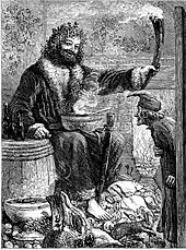 The Ghost of Christmas Present is described as "a jolly Giant", and Leech's hand-coloured illustration of the friendly and cheerful Spirit, his hand open in a gesture of welcome confronted by the amazed Scrooge has been described by Jane Rabb Cohen as elegantly combining "the ideal, real, and supernatural" with humour and sympathy.[15] It is clear that the Spirit is based on Father Christmas, the ancient patriarchal figure associated with the English Christmas holiday, traditionally a bearded pagan giant depicted in a fur-lined evergreen robe wearing a crown of holly while holding mistletoe. Father Christmas, or Old Christmas, was often represented as surrounded by plentiful food and drink and started to appear regularly in illustrated magazines of the 1840s.[16]