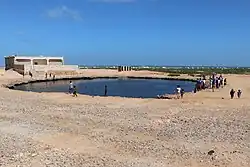 Another water pool is located just south of the main road bypassing the village. It is a brackish and muddy salty sink hole of larger dimensions, 120 m x 90 m but barely 2 m deep. On the shallow surrounding ledges the villagers have built small salt evaporation pans for salt winning.[2] This water pool is also dubbed Socotra Crater as some scholars hold that it is a meteor crater.[3] But this theory is controversial.[4]