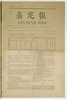 Gia Định Báo (chữ Hán: 嘉定報), or Gia Dinh News was the first Vietnamese newspaper. It was published in Saigon from 1865 to 1910. Pétrus Ky was the editor in chief.[1] "Gia Định" is an alternative name for Saigon, now Ho Chi Minh City. It was a gazette that published official and legal documents, although it also included articles on Vietnamese culture and agriculture.[2] Woodblock printing in Chinese characters remained the norm until the early 20th century, so the paper's use of the modern typography and the Latin alphabet were innovations.[3][2] In the 1890s, it was Vietnam's newspaper of record.[4]