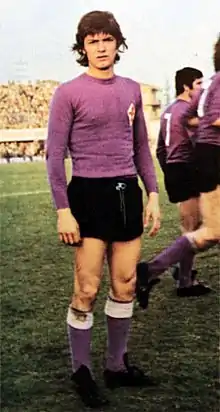 He made his debut in Serie A in October 1972 with Fiorentina, whom he later captained, also eventually inheriting the number 10 shirt. He won the Coppa Italia (Italian Cup) during the 1974–75 season, as well as the 1975 Anglo-Italian League Cup that season, over West Ham.[2] He narrowly missed out on the Serie A title with Fiorentina during the 1981–82 season, losing out to rivals Juventus by a single point on the final match-day. Antognoni played 412 games with Fiorentina and scored 61 goals. Antognoni is regarded as a Fiorentina legend, and as one of the club's best ever players, as he played for the club throughout his entire Italian professional career between the 70s and 80s. He holds the record for the most appearances in Serie A for Fiorentina, with 341 appearances.[1][4][5]