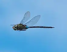This species is one the world's largest living dragonflies and the largest in the United States.[2] It typically has a wingspan of 127–143 mm (5.0–5.6 in),[3] but has been verified to reach up to 152 mm (6.0 in);[4] reports of considerably greater sizes are unverified and highly questionable.[5] The only other member of the genus Anax in Hawaii is the closely related green darner (A. junius), but it is considerably smaller, mainly found in lowlands in Hawaii, and also found in Asia and North America.[2][3]