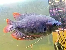 The giant red tail gourami (Osphronemus laticlavius) is a large species of gourami belonging to the family Osphronemidae. This endangered fish is native to the Southeast Asian island of Borneo, where only known from the Kinabatangan and Segama river basins in Sabah, East Malaysia.[1][2][3] First described in 1992 based on an aquarium specimen,[4] its exact range was not entirely certain, leading some source to incorrectly also report it from Indonesia.[5]