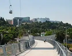 ![]() Looking west on the bridge, toward Marquam Hill and Oregon Health & Science University, with the Portland Aerial Tram passing overhead | |