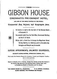 The Gibson House was a well-known and well-regarded hotel in Cincinnati, Ohio, and the precursor of the Hotel Gibson. The Gibson House was located on Main St. between 4th & 5th (south of Fountain Square) until the 1970s.