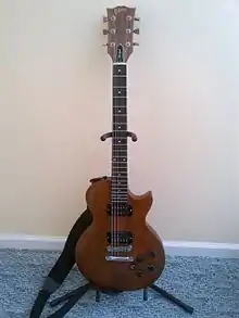 The Paul Standard had a single sharp cutaway Les Paul-style walnut body,[2] set walnut neck, 22-fret ebony fingerboard with pearl dot inlays, walnut headstock with gold Gibson logo (1978–1981), three-per-side tuners, Tune-o-matic bridge, stop tailpiece, two exposed humbucker pickups, some models had "T" top pickups, four knobs (two volume, two tone), three-way pickup switch, chrome hardware, available in Natural Walnut finish. It had a 24.75-inch (628.6 mm) scale, and 1.6875-inch (42.9 mm) nut width. It was manufactured between 1978 and 1982. The guitar included such high end items as the Grover tuning keys.