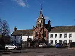 The stone shaft on the 18th century mercat cross in front of the town hall was replaced in 1954.[8] The building remained in private ownership until 1979 when it was acquired by a charity, the Feuars of Gifford.[9] It was then leased at a notional annual rental to the Gifford Community Association,[10] which initiated an extensive refurbishment programme in 1981. The main assembly hall then became a community events venue and also saw use as a creche, a classroom and a gym.[9][11] A further programme of works to install a wheelchair lift in the complex was completed in 2017.[12]