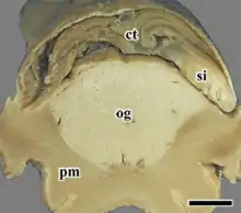 The oesophageal gland is fused and enlarged to fill the entire ventral side of mantle cavity.[3] It is occupying 0.6% of visceral mass volume in juveniles, while it is increasing allometrically up to 9% visceral mass volume in adults.[3] Blood sinuses are large, but few and fixed in position.[3]