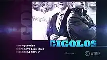 - ↑ "The Men of Sin City Are Back on Showtime(R) - Season 2 of "Gigolos" to Premiere Thursday, October 20th at 11 PM ET/PT". The Futon Critic. September 7, 2011. Retrieved April 14, 2013.
