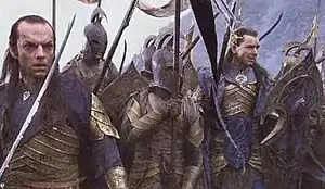 Gil-galad is a fictional character in J. R. R. Tolkien's Middle-earth legendarium, the last high king of the Noldor, one of the main divisions of Elves. He is mentioned in The Lord of the Rings, where the hobbit Sam Gamgee recites a fragment of a poem about him, and The Silmarillion. In the Last Alliance of Elves and Men, Gil-galad and Elendil laid siege to the Dark Lord Sauron's fortress of Barad-dûr, and fought him hand-to-hand for the One Ring. Both Gil-galad and Elendil were killed, and Elendil's son Isildur took the Ring for himself. Gil-galad briefly appears at the opening of Peter Jackson's The Lord of the Rings film trilogy, and features in several video games based on Tolkien's Middle-earth.