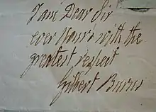 Following Burns's death Gilbert wrote to Ainslie:"I could not help considering the fame of author as well as the respectability and peace of his friends in considerable danger from the publication of letters written on private and confidential subjects." He was concerned that the antiquarian and author, Cromek, had obtained many of Burns's letters and requested that when Ainslie was in London he should call upon Cromek and report back.[40]