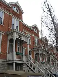 Buildings in the Gilbert Row are generally constructed on foundations of stone; their walls are built of brick or iron, and they feature other elements of brick and stone.[3] Most buildings in the group do not feature iron: it is only present in the cast iron front of the building constructed as a store. Typical houses in the row feature porches with hip roofs, wooden posts with chamfered and reeded details, lattice-shaped valences, and ornamental brackets. Setting the complex apart from almost all other groups of rowhouses in the city is its general architectural style:[2] it is a clear example of the Queen Anne style of architecture,[1] which was rarely employed in the construction of rowhouses in Cincinnati.[2]