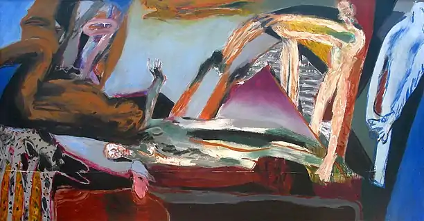 His art shows influence from David Alfaro Siqueiros, Carlos Orozco Romero, Raúl Anguiano and Ignacio Aguirre.[6] His work is considered to be between that of the Muralist generation and that of the Generación de la Ruptura, with elements of both but he preferred to be classed with the Ruptura.[2] Aceves Navarro's work has also been described as a precursor to figurative expressionism.[6]