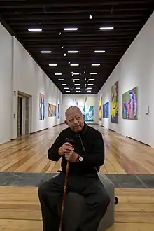 His first exhibition was called "Energía" at the Galería Nuevas Generaciones at La Esmeralda which was well received.[6] He has had over 200 individual exhibitions of his work since his first in 1954, with participation in over 300 collective shows.[4][6] Every year since 1970, he has had multiple exhibitions mostly in Mexico but abroad as well.[6] His work has frequently been shown at locations in Mexico City such as the Salón de la Plástica Mexicana (of which he is a member), Galeria del Aeropuerto Internacional, the Museo de la Estampa, Museo Carrillo Gil, Museo de Arte Moderno, the various galleries of the Escuela Nacional de Artes Plásticas and at the Palacio de Bellas Artes.[7] Other places in Mexico where his work has been shown include the Museo Contemporáneo in Toluca, the gallery of the University of Sinaloa, Galería Juan Cabrera in Puebla, Instituto Regional de Bellas Artes in Aguascalientes and San Luis Potosí. Galeria Miro in Monterrey, Galeria Migritte in Guadalajara, Instituto Cultural Cabañas in Guadalajara, Museo de Arte Moderno in Toluca, Museo Biblioteca Pape in Coahuila, Arte Actual Mexicano in Monterrey, ITESM Campus Estado de México and the Instituto Chiapaneco de Cultura. Outside of Mexico, his work has been exhibited 1958 Pan American Union meeting in Washington, D.C., the Brooklyn Museum, La Joya Gallery in Los Angeles, Bienal Latinoamericana in São Paulo Brazil, Casa de las Américas in Havana, Museo de Arte Contemporáneo at the University of Chile, the Museo de Bellas Artes in Bogota, Colombia and the Museo de Artes Plásticas y Visuales in Montevideo, Uruguay, IBM Gallery in New York, Sagacho Exhibit Space in Tokyo, Pabellón de las Artes, Expo-Sevilla Spain, Hamburische Landesbank in Hamburg, Norddeutsche Landesbank in Hanover.[5] In 2008 there was a retrospective with over 400 of his works at the Palacio de Bellas Artes.[7]