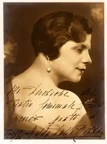 Born in Verona, she made her operatic debut in Bologna (the Teatro Verdi) in 1912, as Charlotte in Werther. Especially acclaimed in the verismo repertory, she was regarded as being Giacomo Puccini's favorite soprano, creating Magda in his La rondine (1917). Although he composed the part of Minnie in La fanciulla del West for another soprano, when Puccini saw Dalla Rizza in the part, he said, "Behold, at last I have seen my Fanciulla".[1] She also gave the first European performances of his Suor Angelica and Gianni Schicchi, at Rome in 1919, in the presence of Victor Emmanuel III, King of Italy. He also had her in mind for Liù in Turandot, though her voice proved too heavy for the part of the young slave-girl by the time of the premiere.