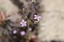 Flowers appear in small clustered inflorescences at the ends of the stem branches. Each is on a pedicel covered in hairlike black glands. The glandular flower has a small throat opening into a flat-faced pinkish-lavender corolla with five protruding purple-anthered stamens. The center of the flower and throat may have purple and yellow blotches. The fruit is an egg-shaped capsule about half a centimeter long.