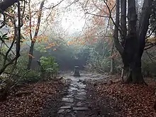 The flora of Gillies Hill is intricately entwined with its history. The Murray family who built Polmaise Castle in 1865, created landscaped gardens incorporating many of the exotic coniferous trees that still grace the woodland. Like much of 19th Century British aristocracy, the Murrays were enamored with planting landscape gardens filled with newly discovered plants from around the world. Often these outdoor plant collections included tall conifers imported from North America. A fine example of this is the grove of Sierra Redwoods (or Wellingtonia), Sequoiadendron giganteum, growing at the apex of Gillies Hill. These five Redwoods were planted in the 1860s by the Murray family along the walk from the castle to the large natural loch that was once on the upper portion of Gillies Hill, but was lost to quarrying. If left undisturbed, these giants could well live over 3000 years and attain a mass of over 1400 cubic meters potentially becoming the most massive trees in Scotland.[6] Along with others of that era, these trees may have been grown from some of the first Sequoiadendron seeds brought to Scotland by John D. Matthew in 1853 and given to his noted horticulturist father Patrick Matthew of Gourdiehill near Errol in Perth Shire who then gave many of the seedlings away to friends and family as living gifts. Unfortunately, the five redwoods on the top of Gillies Hill are within the quarry zone. Efforts are currently being made to try to save the grove.