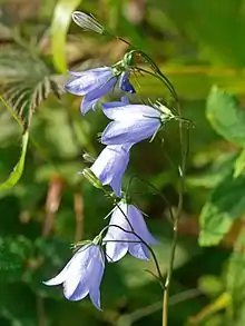 As of 2013 over 200 species of flowering herbs, shrubs, trees (angiosperms), coniferous trees (gymnosperms); and rushes (Juncus) and sedges (Carex) have been inventoried on Gillies Hill.[7] The first flowers to appear on Gillies Hill after the cold of winter are the snowdrops which surround the ruined Fir Park Cottage. In May the forest floor along Old Drove Road is carpeted with English bluebells. These bluebells, Hyacinthoides non-scripta, are commonly confused with the Scottish bluebell or harebell, Campanula rotundifolia, which blooms throughout the summer, is lighter blue in color and is usually found in the higher reaches of Gillies Hill.