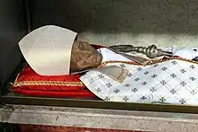 In exile, Giordano went first to the patriarchate of Aquileia, where he is recorded on 26 May 1239. He later decided to leave the Empire entirely and took refuge in the monastery of Santa Maria della Celestia in the Republic of Venice. He died there on 7 August 1248. His body was returned to Padua in 1260. In the following century, a hagiographical tradition developed. His cult was approved by Pope Clement XIII in 1767.[1] His feast is celebrated on 7 August.[3]