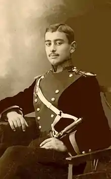 Giorgi Khimshiashvili was born in the noble family from the eastern Georgian region of Kakheti, then part of the Russian Empire. His father, Prince Nikoloz Khimshiashvili (Khimshiyev) was assassinated in 1910, as police concluded, for helping the authorities to reveal the murderers of Prince Ilia Chavchavadze, a leading Georgian writer and intellectual.[1] Giorgi Khimshiashvili was educated at the Nicholas Cavalry College in St. Petersburg and fought in the Russian ranks as cornet in World War I. He took part in the Caucasus and Persian campaigns.