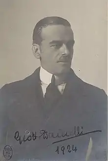 Dainelli was born in Florence, the son of General Luigi and Virginia Mari. He grew up travelling with his father both on work and on travel. He studied natural sciences at Florence, graduating in 1900 with studies under the geologist Carlo De Stefani (1851-1924) before joining the University of Vienna. He studied the Friulian Prealps north of Venezia Giulia. He also studied the Pliocene of Italy along with P. Videsott and A. Sestini. He became a lecturer at Florence in 1903 and from 1914 at the University of Pisa as a chair of geography. He travelled to Eritrea along with Olinto Marinelli, Lamberto Loria and Aldobrandino Mochi in 1905–6.[1] This expedition followed after he attended the Italian Colonial Congress at Asmara.[2] In 1913-1914 he travelled to the Karakoram and Himalayas along with the expedition headed by Filippo De Filippi. Other members of this expedition included Giorgio Abetti, Nello Venturi Ginori, Camillo Alessandri, Lieutenant Alberto Alessio, engineer John Alfred Spranger, Major Henry Wood of the Survey of India along with surveyors Janma Prasad and Shib Lal, alpine guide Joseph Petigax, and Lieutenant Cesare Antilli.[3][4][5] In 1921 he moved to Naples and in 1924 moved back to Florence to take the place made vacant by De Stefani upon his death. He made another expedition into the Horn of Africa in 1936–37. He taught until 1944 with a break during World War II. A supporter of fascist rule, he was favoured by Benito Mussolini who made him Podestà (mayor) of Florence in 1944. He served as the president of the Academy of Italy from 1944 to 1945, following the assassination of Giovanni Gentile by the Gruppi di Azione Patriottica (gappisti). He wrote an autobiography in 1967.[6][7] His collection of expedition photographs are held by the Italian Geographical Society.[8][9] Dainelli published more than 600 works. Punta Dainelli, a peak in the Georgian Kazbegi Mountains of the Caucasus is named after him.[10] A fossil Trigonia (Lyriodon) dainellii was named from his collections after him by Venzo in 1945.